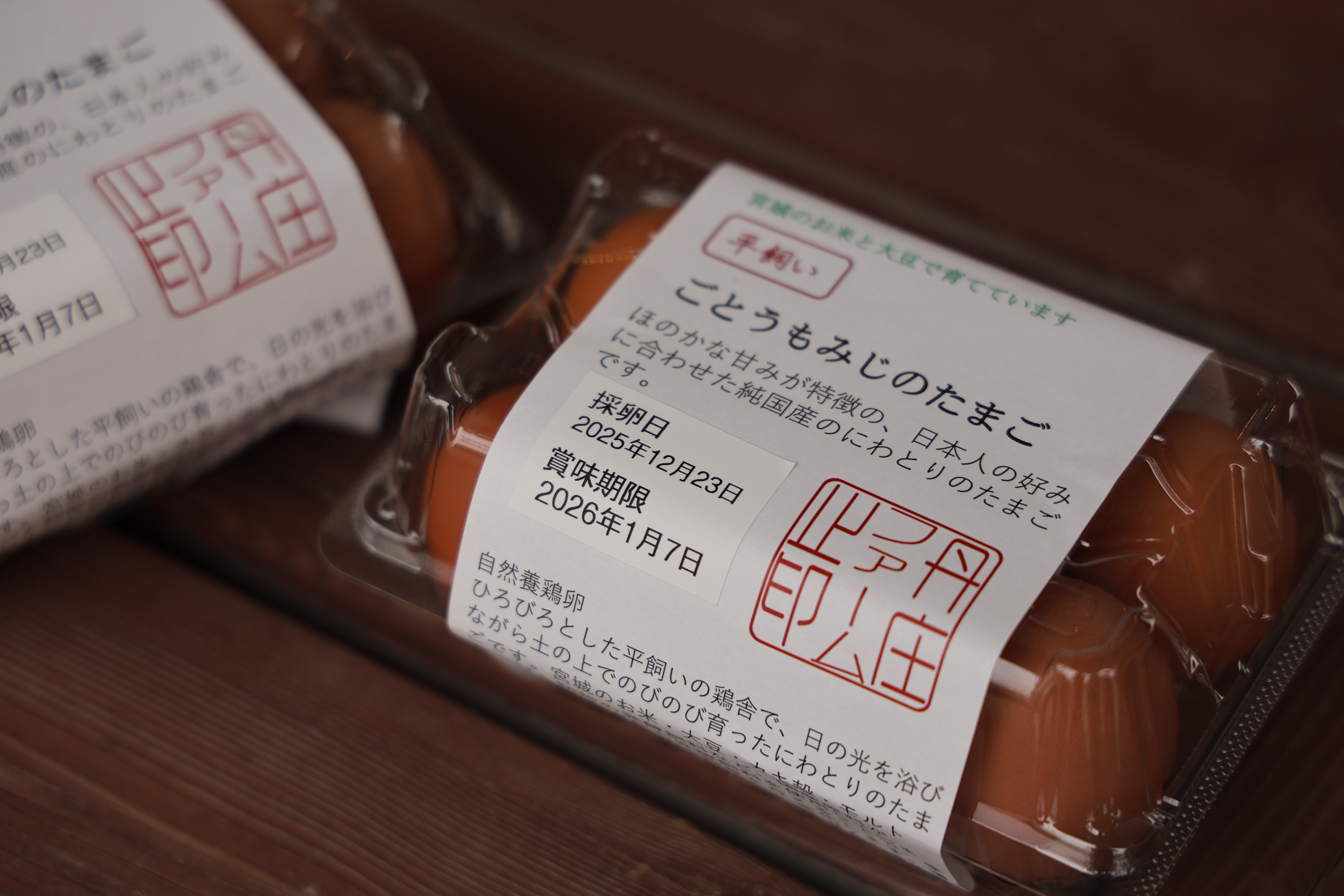丹庄ファームのたまごは、採卵日を明示しています。生食用に鮮度の良い物が欲しいときも、ゆで卵やケーキ用にある程度時間が経過したたまごが欲しいときも、採卵日の表示があるので、しっかり管理ができます。(実質、採卵日は産卵日と同じ日になります。)