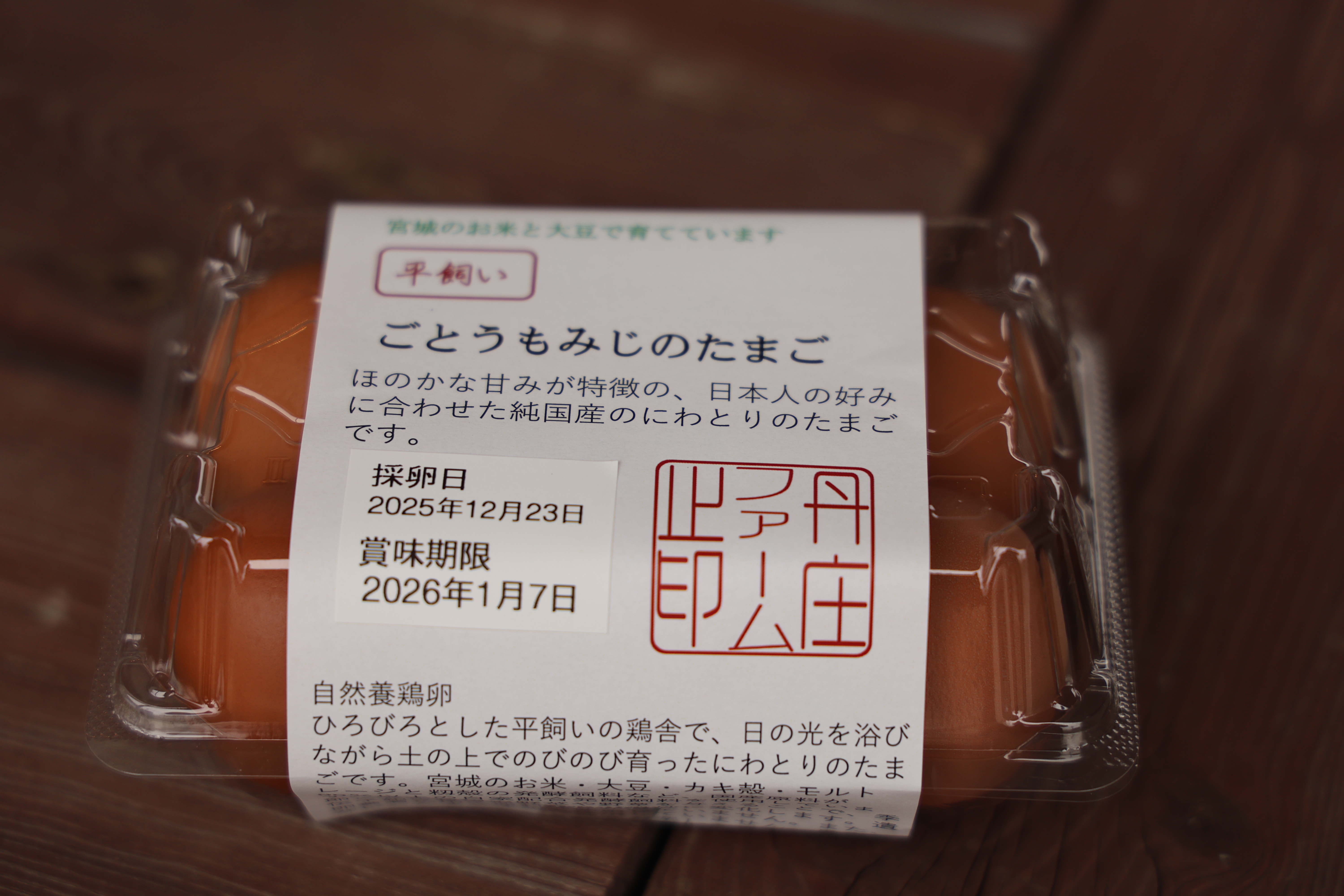 宮城のお米と大豆で育てています。仙台市宮城野区岩切の小さな平飼い養鶏場、丹庄ファームです。 日の光を浴び、土の上を自由に走り回っている平飼いの純国産鶏が産む、安全安心のたまご。 地元宮城産がメインの自家配合発酵飼料。遺伝子組み換え作物は使用していません。