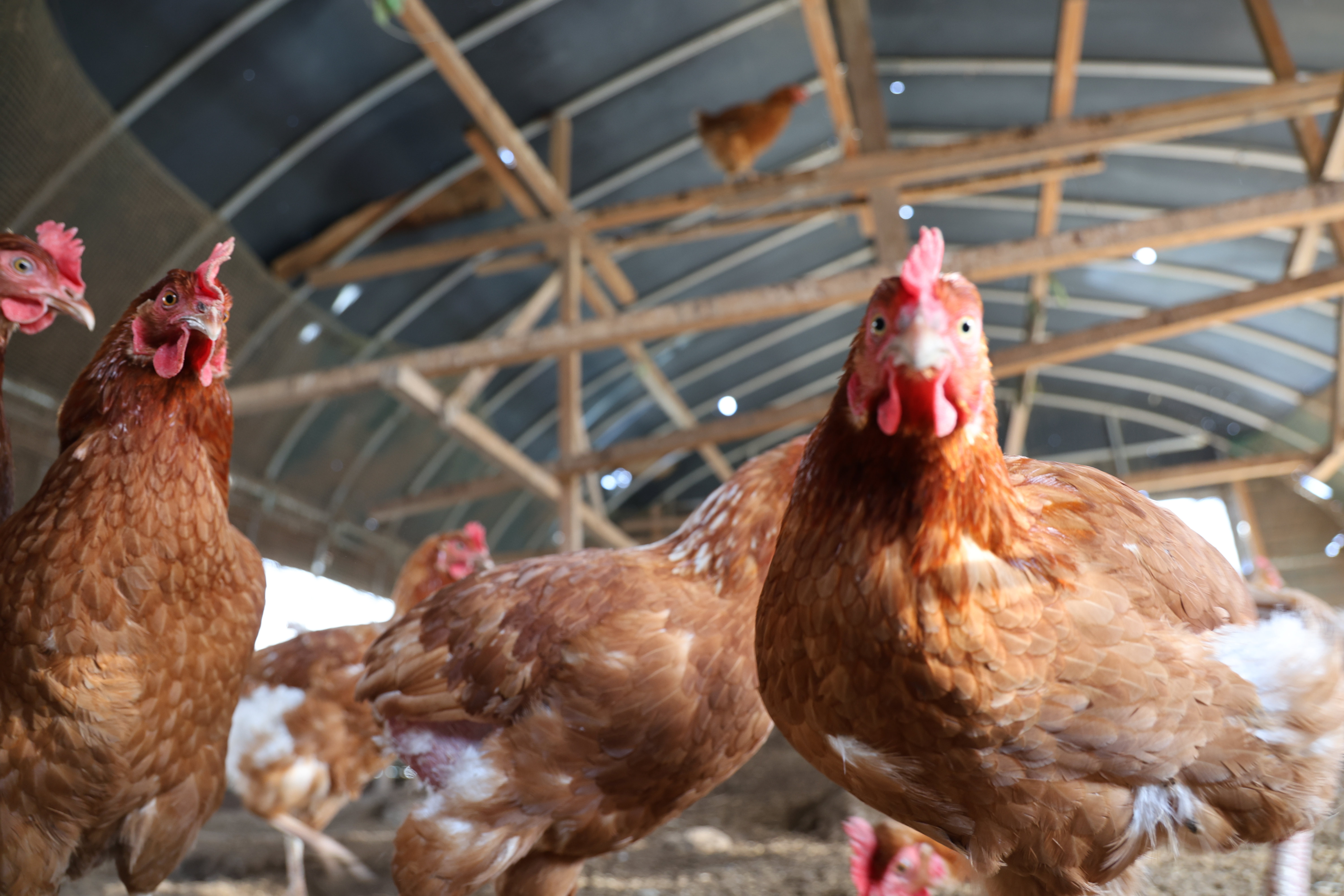 丹庄ファームの鶏舎は、遮光ビニールが貼られたビニールハウスです。キツネや猫の侵入を防ぐため、内側は板や金網で目張りをしています。南北方向は、大きく開閉でき、冬の夜間や、気温が低くて風のある日、暴風の日は開閉部を閉めて、鶏舎内が穏やかな気候になるようにしています。ビニールハウスと聞くと、夏は暑そうに感じるかもしれませんが、風通しの良い木陰にいるような感じで、夏でも屋外のような暑さにはなりません。東西面には、鶏のストレスを減らすため、鶏舎の外から採卵ができる産卵箱をセットしています。