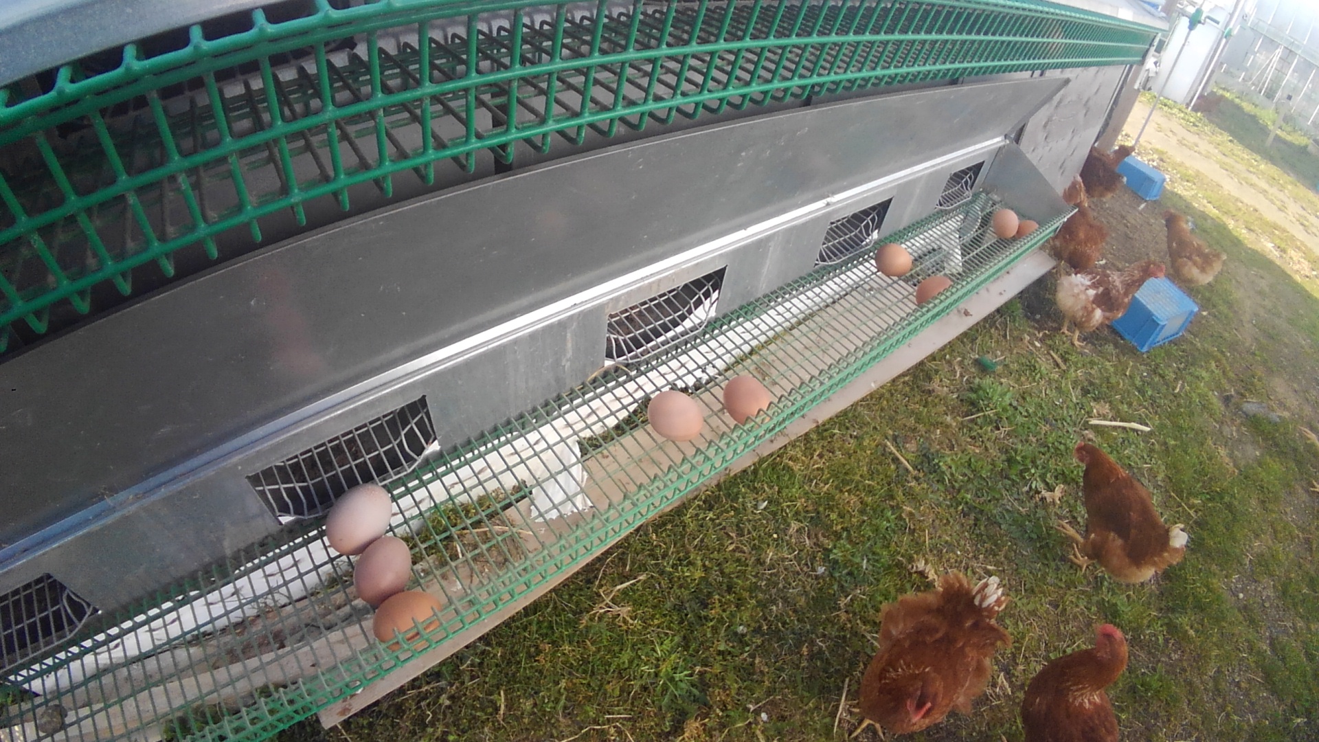 にわとりは、専用の産卵巣(スチールネスト)に入ってたまごを産みます。産んだたまごは、ネストの外に集まり、鶏舎に入ることなく採卵ができます。中には、地面にたまごを産んでしまうにわとりもいますが、丹庄ファームではネストに産卵したたまごのみパッキングしています。(地面に産んだたまごは、自家用で消費しています。)